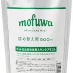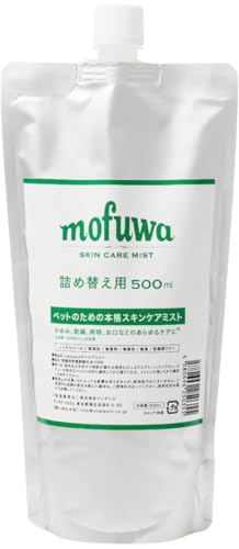 カイカイや赤み、フケに対応したペット用スキンケアミスト。犬猫兼用の500ml詰替用で、肌荒れや乾燥を防ぎます。無添加・無香料で除菌・保湿効果があり、低刺激な国産品です。mofuwa(モフワ)製。