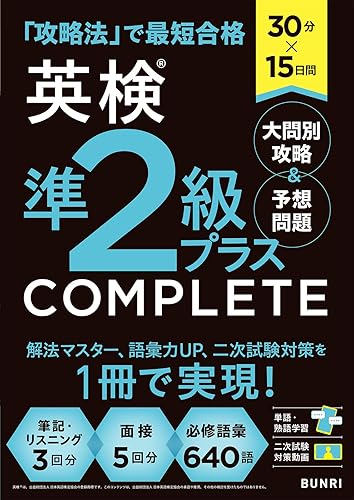 『30分×15日間 英検準2級プラス COMPLETE 大問別攻略&予想問題』は、英検準2級対策のための問題集です。各大問ごとに攻略法を解説し、15日間で効果的に学習できる構成。予想問題も収録され、実践力を高めるための一冊です。