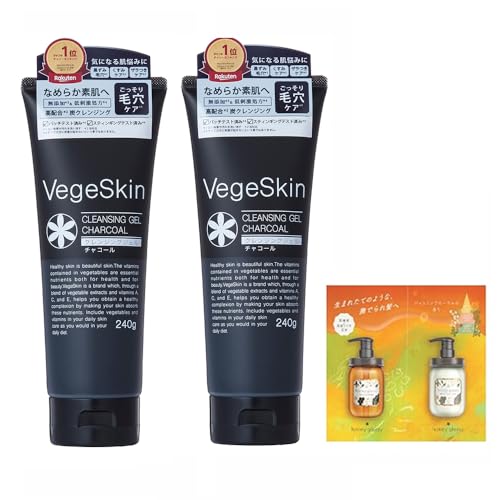 VegeSkin(ベジスキン)のクレンジングジェルチャコール240gが2本セット。無添加で低刺激、毛穴ケアに最適。シャンプー&トリートメントお試し品付き。