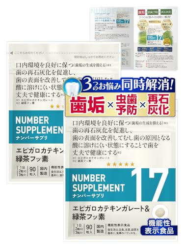 ナンバーサプリ17 お口ケアタブレットは歯垢、虫歯予防、歯の再石灰化をサポートする機能性表示食品です。エピガロカテキンガレート、フッ素、キシリトール配合。無添加、国産でグレープフルーツ味の90粒が2袋セット。