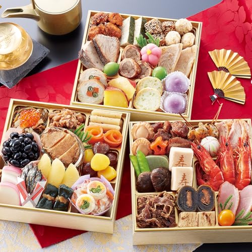 冷蔵盛付済のおせち、京都宮川町料亭「水簾」監修の瑞兆。6.5寸3段、45品目で約3~4人前。解凍不要で、12/30日のお届け。