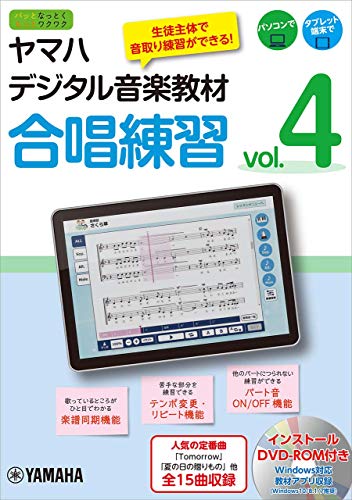 ヤマハデジタル音楽教材 合唱練習 Vol.4は、DVD-ROM付で合唱の技術を学べる教材です。楽譜や練習用音源を収録し、指導者向けのガイドもあり、幅広いレベルに対応しています。