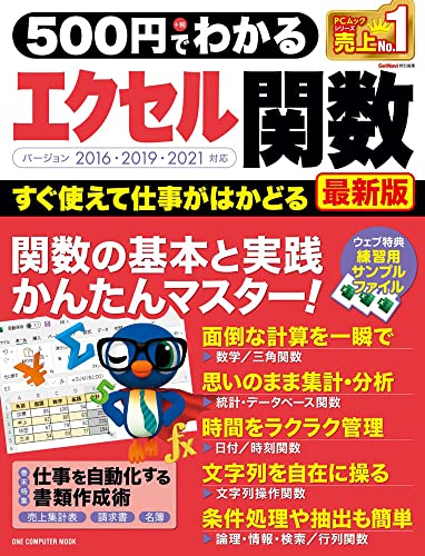 『500円でわかるエクセル関数 最新版 (ONE COMPUTER MOOK)』は、エクセルの基本的な関数を短時間で学ぶための手引きです。初心者向けで実用的な内容が特徴です。