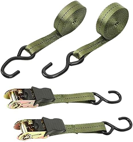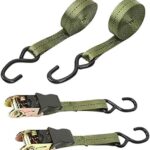 荷締めベルト ラチェット式、ベルト長4m、破断荷重800kgの2本セット。多用途に適し、引越しや運搬に最適な固定バンド。カラーはグリーン。