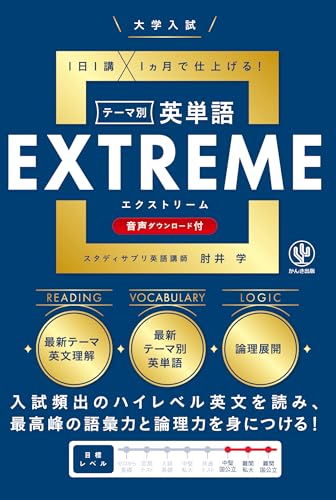 大学入試テーマ別英単語エクストリーム(EXTREME)は、受験生のために厳選された英単語を効率的に学べる参考書です。各テーマに沿った単語リストと、例文が掲載されており、実践的な学習をサポートします。
