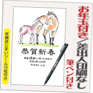 年賀状 2026 お年玉付き 年賀 はがき【12枚 筆ペン付き】午年 うま年 年賀状じまいシール付 印刷 プリント 10枚+2枚 差出人なし(デザイン:HA032)