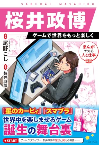 まんがで知る人と仕事『桜井政博 ゲームで世界をもっと楽しく』は、ゲームクリエイター桜井政博の仕事や情熱を描いた作品です。ゲーム制作の裏側や、楽しい体験を提供することの重要性が伝わります。