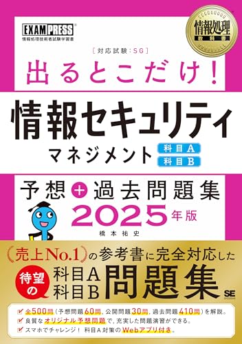 情報処理教科書 出るとこだけ!情報セキュリティマネジメント[科目A][科目B]予想+過去問題集 2025年版は、試験対策に特化した教材です。最新の情報を元に予想問題と過去問題が収録され、合格に導く内容になっています。