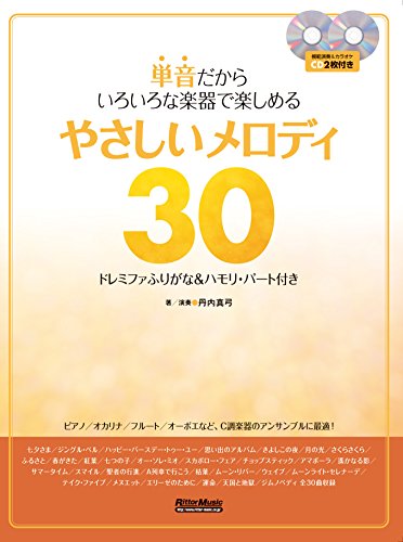 「単音だからいろいろな楽器で楽しめる やさしいメロディ30」は、ドレミファのふりがなとハモりパートが付いた楽譜集です。CDは2枚付属し、様々な楽器での演奏が楽しめます。