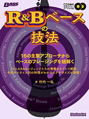 『R&Bベースの技法 16の主要アプローチからベースのフレージングを紐解く』は、CD2枚付きのムック本です。R&Bのベースフレージングを16のアプローチで徹底解説しており、収録内容はダウンロードも可能です。
