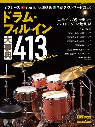 『ドラム・フィルイン大事典413 New Edition』は、リットーミュージックから刊行されたドラムプレイヤー必須の参考書です。多様なフィルインパターンを413種収録し、実践的な練習に役立つ内容となっています。
