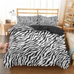 布団カバーはシングルサイズ150x210cm、ゼブラ柄でマイクロファイバー素材。セットには羽毛布団カバーと43x63cmの枕カバーが含まれ、ファスナーで閉じられています。