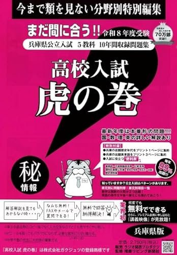 高校入試虎の巻兵庫県版 令和8年度受験は、兵庫県公立入試の5教科を対象にした10年間の収録問題集です。過去問題を通じて受験対策を強化し、効率的な学習をサポートします。