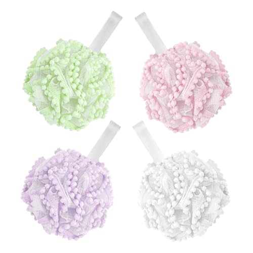 FIXOSHEEの4個セット可愛い色の小型バスボールは、柔らかい肌に優しいシャワーローファーです。持ち運びが便利で、ボディスクラバーとして背中、首、脚の角質ケアに最適です。