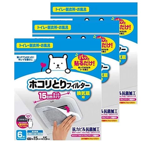 【計18枚】パッと貼るだけのホコリ取りフィルター。換気扇用15cmサイズで、6枚入りが3個セット。手軽に取り替え可能で、お手入れの手間を軽減します。