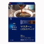 AGF ちょっと贅沢な珈琲店 スティックブラック マスターのこだわりブレンドは、18本入りのスティックコーヒーです。豊かな風味と深いコクが特徴で、手軽に本格的な味わいを楽しめます。インスタントコーヒーとしてもこだわりの一杯を実現。