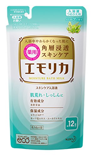 エモリカ薬用スキンケア入浴液は、ハーブの香りでリラックス効果があり、赤ちゃんにも使用可能です。360mlのつめかえ用液体入浴剤で、敏感肌にも優しい成分が配合されています。