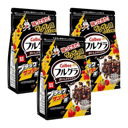 フルグラ ブラックサンダー味 500g FKは、香ばしい黒糖とココアの風味を楽しめる朝食専用のグラノーラです。栄養豊富で、手軽にエネルギー補給ができるので、忙しい朝にもぴったり。3袋セットでお得です。