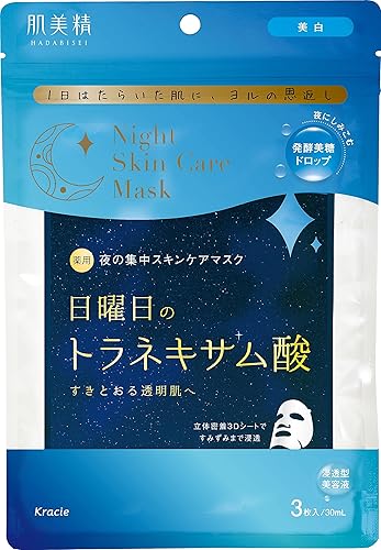 肌美精の薬用ナイトスキンケアマスクは、トラネキサム酸配合で美白効果をサポート。シミやそばかすをケアし、夜間の肌の修復を促進します。3枚入りで、スキンケアに最適なシートマスクです。