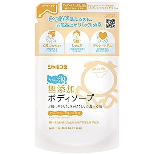 シャボン玉の無添加ボディソープは、470mLの詰め替え用で、豊かな泡立ちが特徴です。手のひらに優しく馴染み、肌に潤いを与えながら、天然成分で優しく洗い上げます。