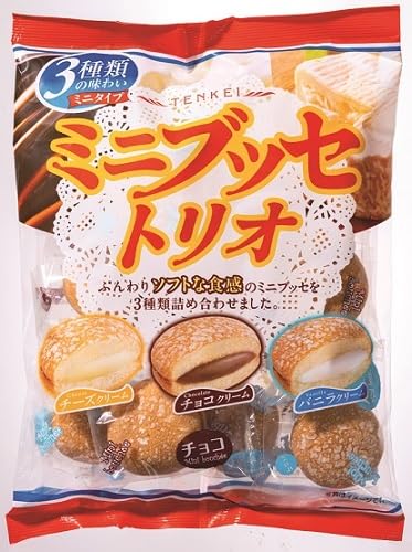天恵製菓のミニブッセトリオ130gは、軽やかなクリームをサンドしたブッセのアソート。風味豊かで食べやすいサイズ感が魅力。家族や友人とのシェアにぴったりのスイーツです。