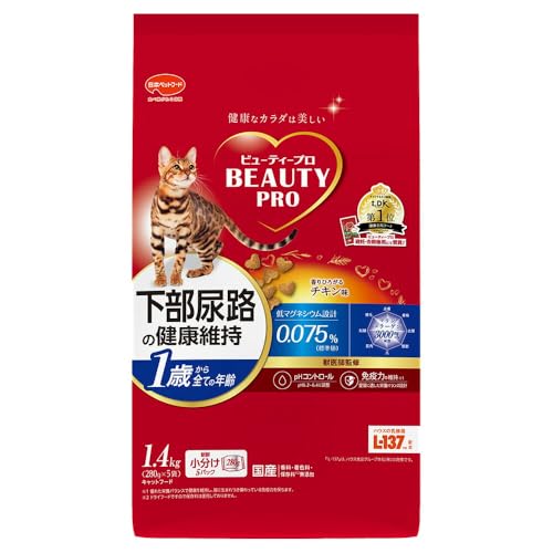 ビューティープロキャットフードは、1歳以上の猫に最適なチキン味の1.4kgパックです。下部尿路の健康維持をサポートし、獣医師監修で安心。国産で小分包装されており、使いやすさも考慮されています。