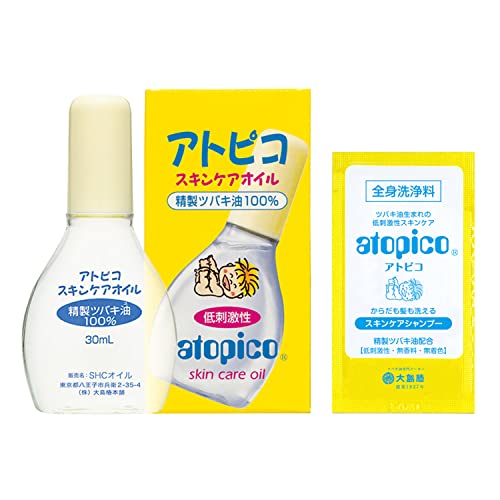 大島椿 アトピコ スキンケアオイルは、敏感肌や乾燥肌向けの低刺激性ベビーオイルです。無香料で精製ツバキ油100%使用。顔全身の保湿に最適で、30mLサイズにおまけ付き。