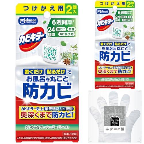 【Amazon.co.jp 限定】カビキラー お風呂に置くだけ防カビジェル さわやかなフレッシュガーデンの香り。付け替え用×2個セット(2P×2)手袋付き。お風呂や浴室の掃除に最適。まとめ買いで便利。