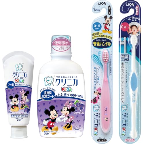 クリニカKid’sオーラルトータルケアセットは、ハミガキ(グレープ)60g、3-5才向けハブラシ、デンタルリンス(グレープ)250ml、仕上げみがき用ハブラシが含まれ、子どもの口腔ケアをサポートします。