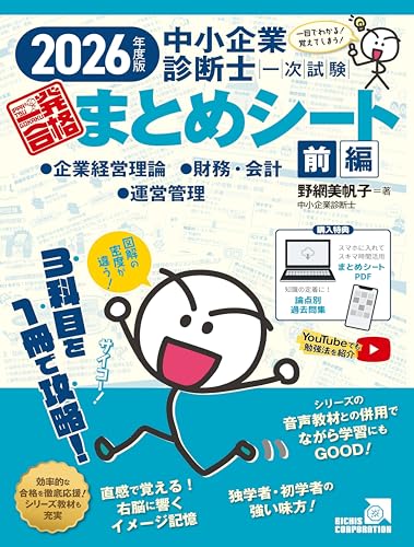 2026年度版 中小企業診断士1次試験一発合格まとめシート前編は、企業経営理論、財務・会計、運営管理の重要ポイントを網羅した学習ガイドです。効率的に知識を整理し、合格を目指す受験生に最適です。