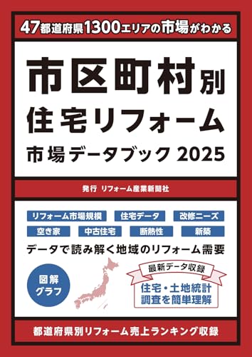市区町村別 住宅リフォーム市場データブック2025は、地域ごとのリフォーム市場動向、消費者ニーズ、主要商品やサービスの分析を提供します。市場規模予測や競合動向も含まれ、リフォーム業界の戦略策定に役立つデータが満載です。