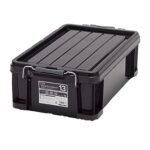 カインズのフタ付ハードコンテナ#13は容量13Lで、幅29.5cm、奥行44.3cm、高さ15.9cmのブラックカラー。目盛り付きで積み重ね可能な収納ケースです。