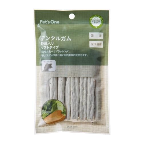 カインズのPet’sOneデンタルガムは、14本入りの国産ソフトタイプ。全犬種用で、噛むことでデンタルケアやオーラルケアをサポートし、野菜入りで栄養もプラス。