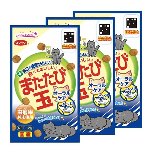 スマック またたび玉は、かつお味のオーラルケアおやつです。12gが3個セットになっており、猫のストレス軽減や歯みがき効果が期待できます。おいしい味で楽しみながら健康をサポートします。