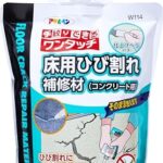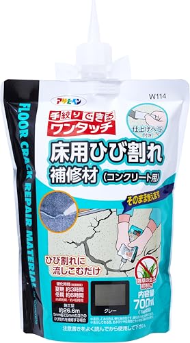 アサヒペンの充填材は、コーキング材として床のひび割れを修理するための700mlのグレーの手絞りパウチです。水混ぜ不要で、塗料の上からも使用できます。日本製で便利なヘラ付きです。