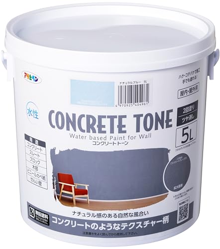 アサヒペン水性コンクリートトーン5Lは、ナチュラルブルーの艶消し塗料です。低臭で抗菌・防カビ・防藻効果があり、シックハウス対策品。日本製で安心して使用できます。