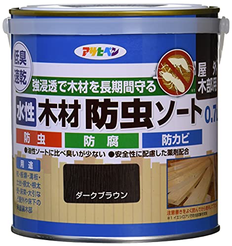 アサヒペンの水性木材防虫ソート(0.7L、ダークブラウン)は木部用の艶消し塗料。速乾性、低臭、カビ・虫・腐敗・シロアリ対策に優れた日本製です。