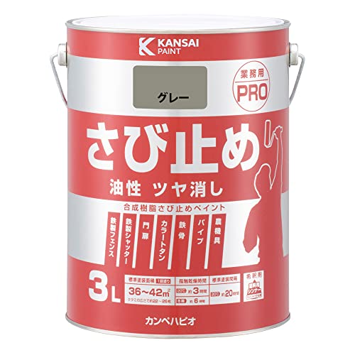 カンペハピオの油性つやけし塗料は、鉄部や鉄製品に最適な防さび剤入りの下塗り用油性さび止めPROグレーです。3Lの日本製で、耐久性と防錆効果があります。