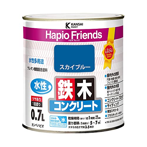 カンペハピオの水性ペンキ、つやありスカイブルーは、0.7L入の日本製塗料です。しっかりとした発色で、室内外問わず様々な素材に使用可能。安全で扱いやすい製品です。