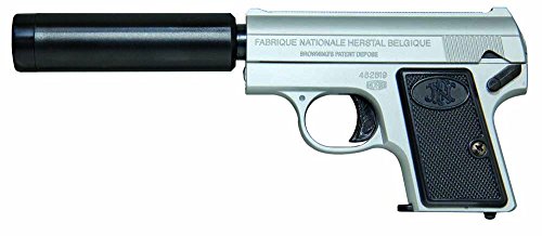 クラウンモデルのポケットハンドガンNo.15は、ベビーブローニングタイプでシルバー仕上げ。サイレンサー付きで10歳以上が対象のエアーHOPハンドガン。リアルなデザインと精密な動作が特徴。