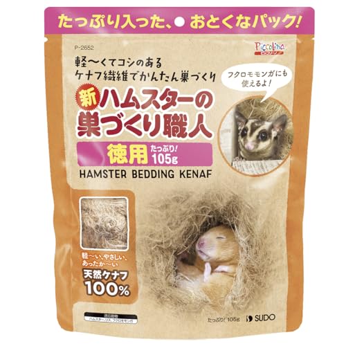 SUDO(スドー) ピッコリーノ 新・ハムスターの巣づくり職人徳用 105g P-2652は、ハムスターが自然に巣を作るための素材を提供する製品です。安全で使いやすく、飼育環境を豊かにします。