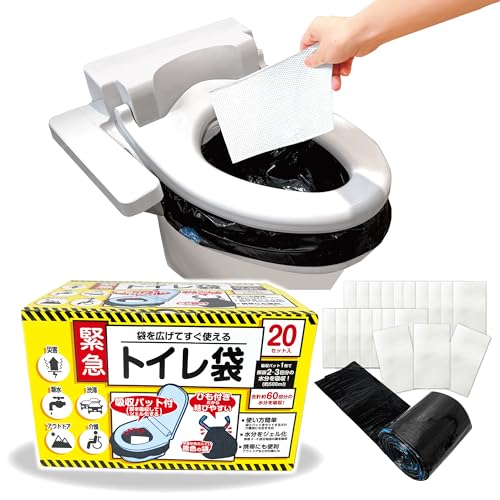 ケミカルジャパンの緊急トイレ袋は、給水パッド付きの20セットで提供される簡易トイレです。災害時や非常用として安心して使用できる防災グッズです。