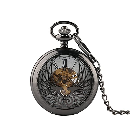 スチームパンクスタイルの中空フェニックス彫刻機械式懐中時計。ブラック/ブロンズのデザインで、ローマ数字ディスプレイやピンチェーン付き。レトロな魅力あふれるコレクターアイテム。