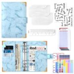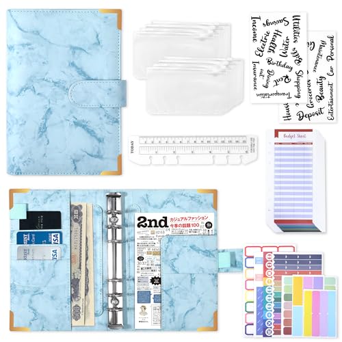 CAGIEの家計管理バインダーはPUレザー製で、大理石ブルーが特徴。ポケット8個付き、ラベルが便利で、予算管理や家計簿に最適。6穴仕様で書類やメモ紙も整理可能。