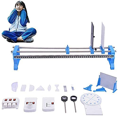 手動ハンズオン研究トライアルの光学実験セット。凹面・凸面レンズ、光学ベンチを含む。物理実験に必要な器具や道具を揃えた教育玩具で、子供向けに最適。