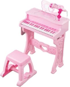 WXQ子供用電子キーボード グランドピアノ おもちゃ イス付き マイク付き 譜面台付き 37鍵 子供の電子ピアノ 知育玩具 楽器 多機能 女の子 男の子 啓蒙楽器 1-6歳 初心者のためのピアノ練習 プレゼント (ピンク)