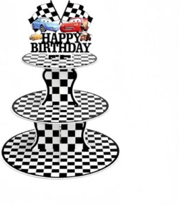 VeriMorph(ヴェリモーフ) レースカーカップケーキ、スタンド、誕生日パーティー用品、3段段ボールカップケーキホルダータワー – 2つの高速カーデコレーショントラックテーマの記念品