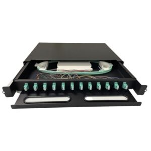 FSiyouda 12ポートLCマルチモードデュプレックスラック取り付けエンクロージャボックス、引き出しスタイルデザイン、24個のLCポート、24コアOM3 1.2Mピグテールを含む、1U 19インチラックに最適