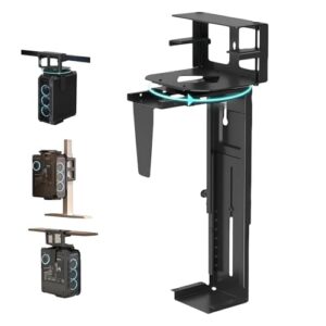 CPUスタンド 吊り下げ デスク下cpuホルダー PC吊り下げブラケット 穴あけ不要 360°回転 高さ/幅調整可能 デスク端/脚/ビーム対応 厚1~10cm 省スペース PCケースマウント ケーブル管理機能付き シャーシ幅(88-205mm)