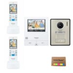 VL-SWD505KFセット品は、ワイヤレスモニター付きテレビドアホンの4点セットです。親機VL-MWD505と子機VL-V574×1台、VL-WD618×2台を含み、メモ用オリジナル付箋も付属。増設設定済で外出先からも家族とつながれます。